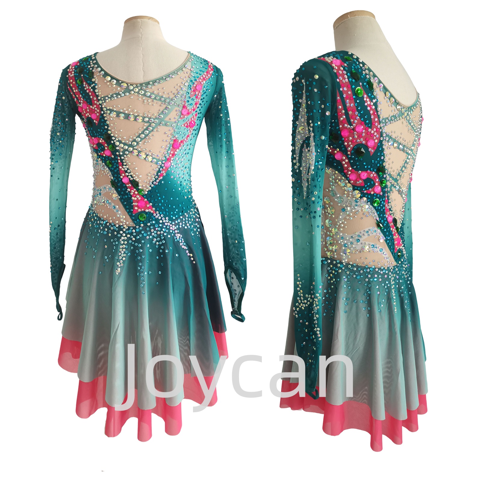 Imagine it: a skater poised in the center of the rink. The deep green fabric flows like water, the jewels sparkle under the spotlights, the long sleeves with their finger loops create an aura of elegant mystery, and the subtle pink accents add a final touch of magic. This dress is a statement. It’s for a program that is both powerful and playful, elegant and energetic.