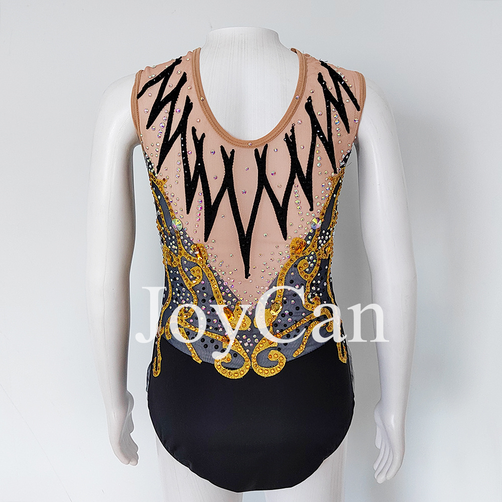 Introducing our stunning black and gold rhythmic gymnastics leotard, designed to bring elegance and sophistication to every performance. This exquisite leotard is the perfect choice for girls who want to stand out on the floor with its captivating design and impeccable craftsmanship. Crafted with meticulous attention to detail, this leotard features a striking combination of black and gold, creating a visually stunning contrast that is sure to catch the eye of the audience. The intricate gold pattern adds a touch of luxury and glamour, making it a standout piece for any rhythmic gymnastics routine. Adorned with shimmering gems and rhinestones, this leotard exudes a sense of opulence and grace, elevating the overall look and feel of the performance. The carefully placed embellishments not only add a touch of sparkle but also enhance the fluidity and movement of the garment, ensuring that every routine is executed with grace and precision. Designed for both style and functionality, this leotard offers a comfortable and secure fit, allowing the wearer to move with ease and confidence. The high-quality materials used in its construction ensure durability and flexibility, making it suitable for intense training sessions and competitive performances. Whether it's a solo performance or a group routine, this leotard is sure to make a statement on the floor, commanding attention and leaving a lasting impression. Its timeless elegance and sophisticated design make it a versatile choice for a wide range of routines and themes. Make a bold and unforgettable impression with our black and gold rhythmic gymnastics leotard. Elevate your performance and showcase your talent with confidence and style. With its unparalleled beauty and exceptional quality, this leotard is a must-have for any aspiring rhythmic gymnast looking to make a lasting impact on the floor.